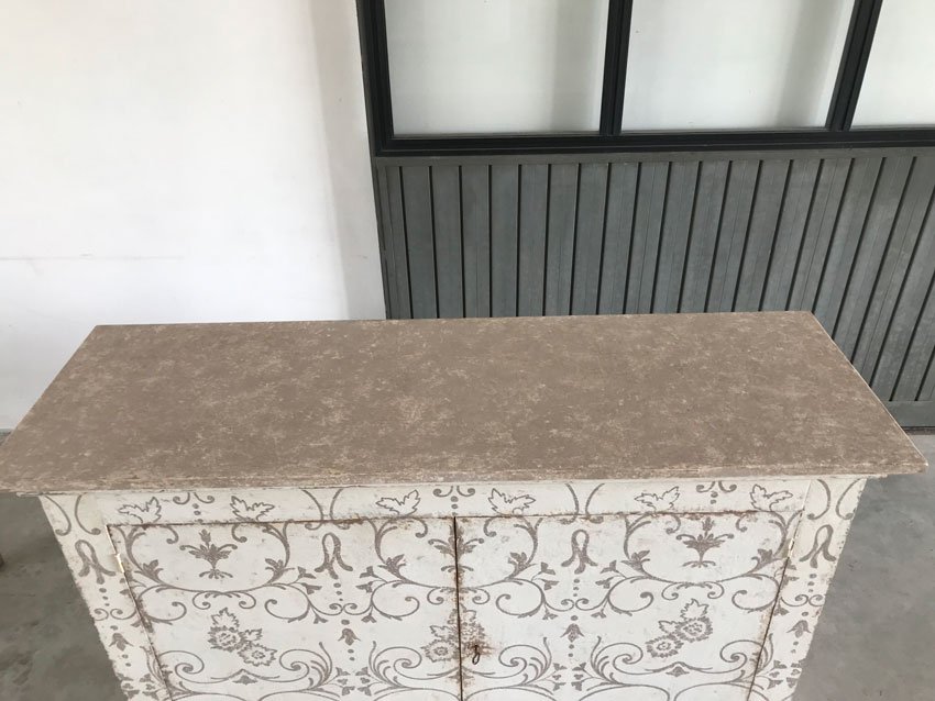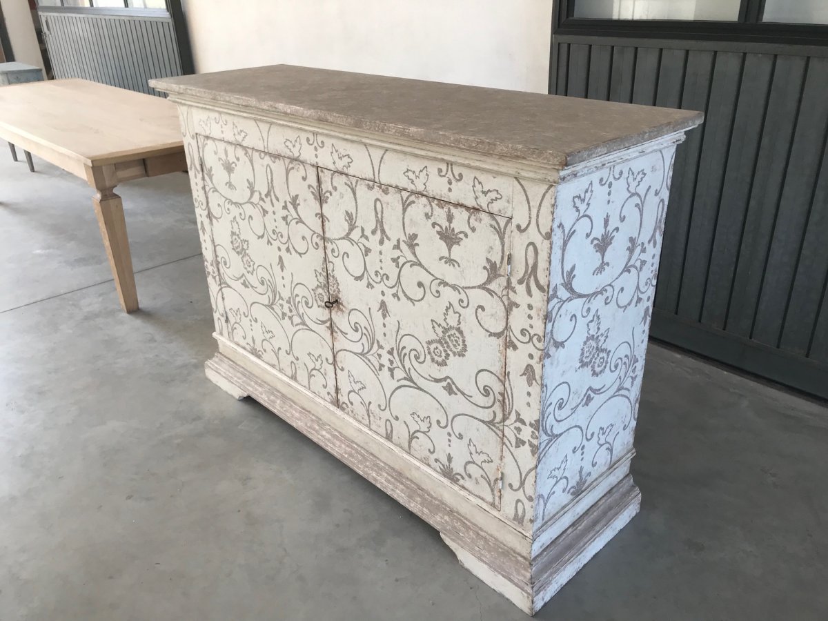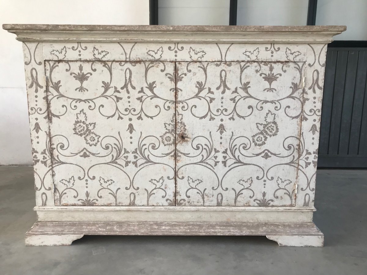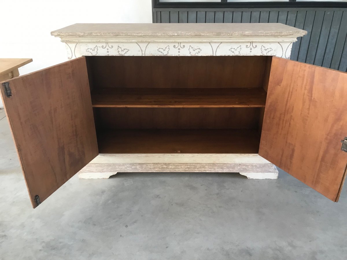 Credenza 2 porte riccamente decorata con un ornato fiorentino che si ripete su tutta la superficie Misure L.165 P.53 H.116MaterialeMassello di pioppo e listellare pioppo