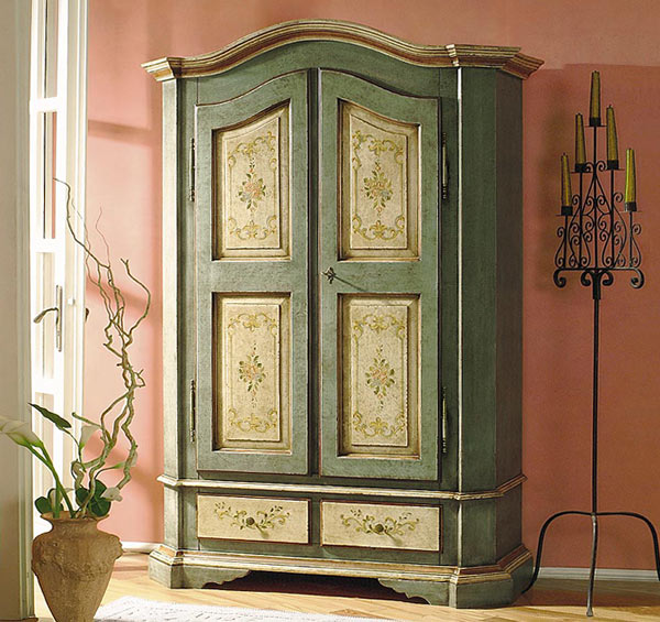 Armadietto 2 ante classico, bella lavorazione della cornice sagomata sul cappello. All'interno 1 paletto e 1 ripiano, su richiesta anche più ripiani. Disponibile con finitura laccata in vari colori o lucido brillante e anticato.