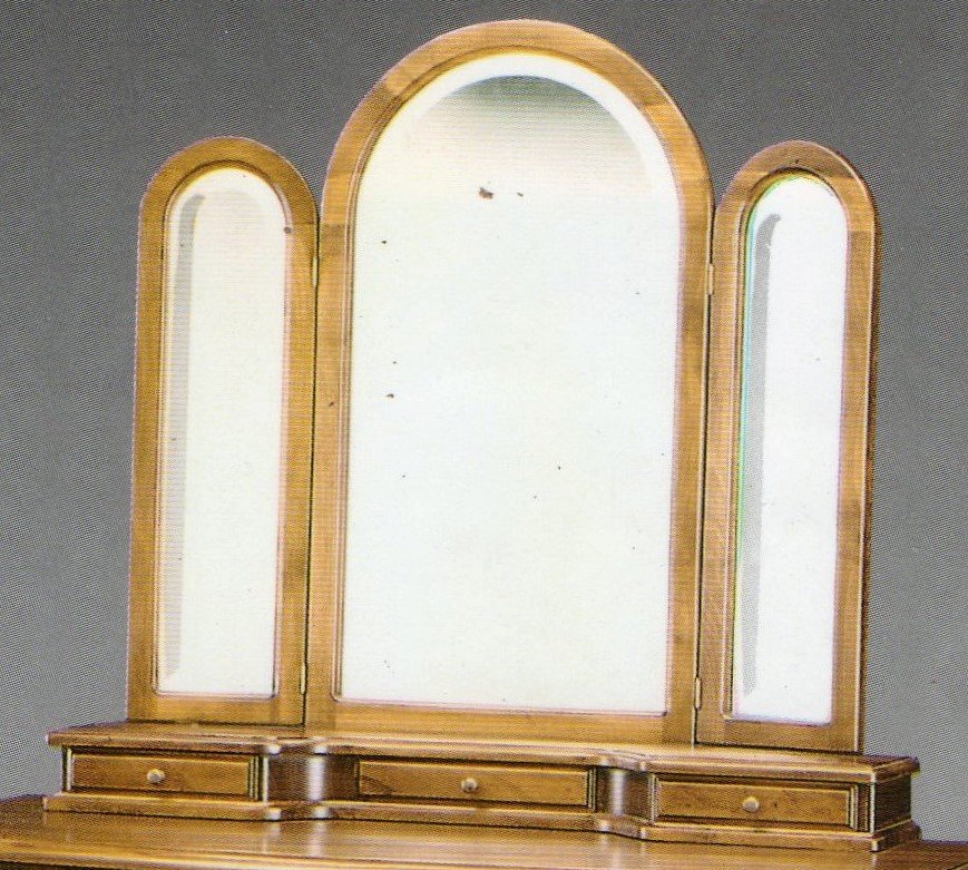 Specchiera da appoggio con specchi laterali semoventi. Disponibile con finitura lucido anticato o laccata in vari colori (per la laccatura il prezzo può variare)