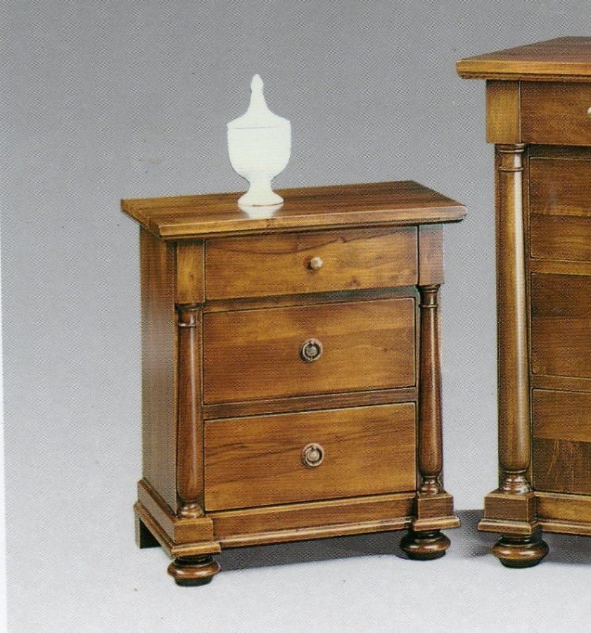 Comodino stile impero costruito in modo artigianale in legno massello di noce, interni in legno massello di abete.Cassetti con incastro a coda di rondine. Misure L.58 P.36 H.65