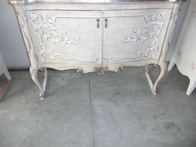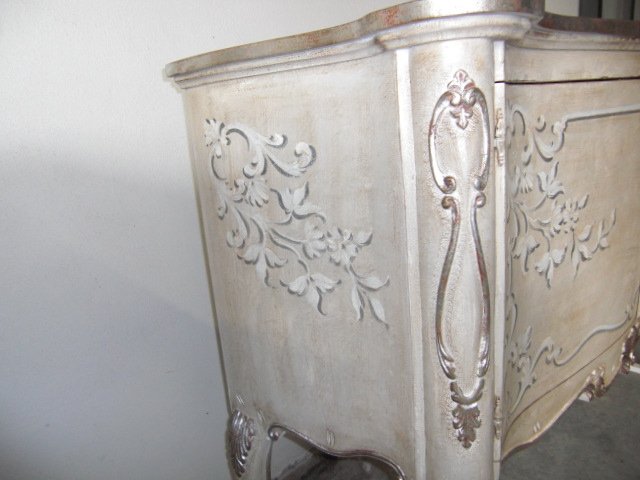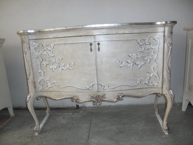Suggerimenti di arredoCredenza intagliata a mano decorata con profili in foglia argento antico.