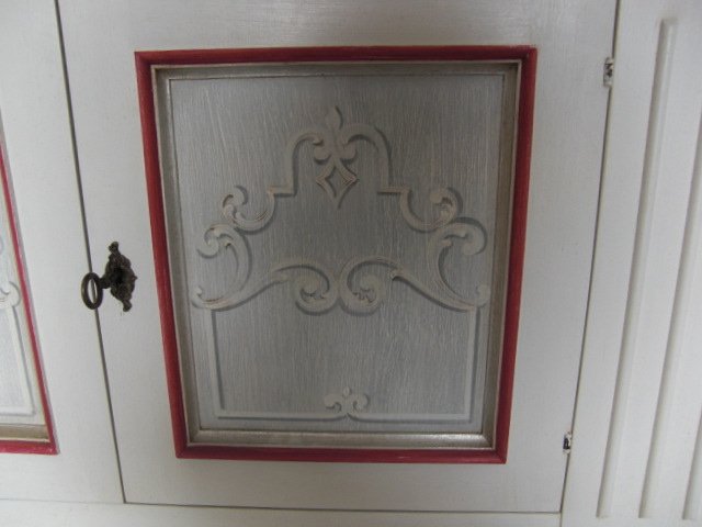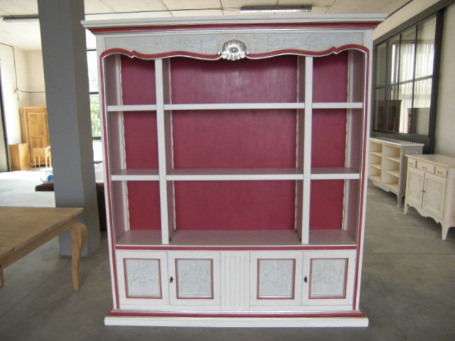 Libreria con motivo intagliato. Misure L.216 P.48 H.233MaterialeLegno massello di pioppo