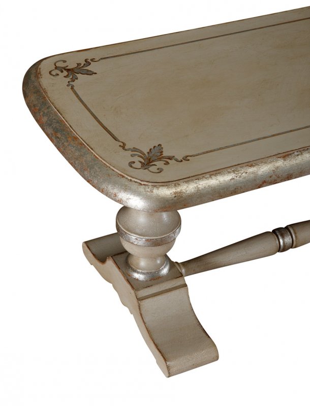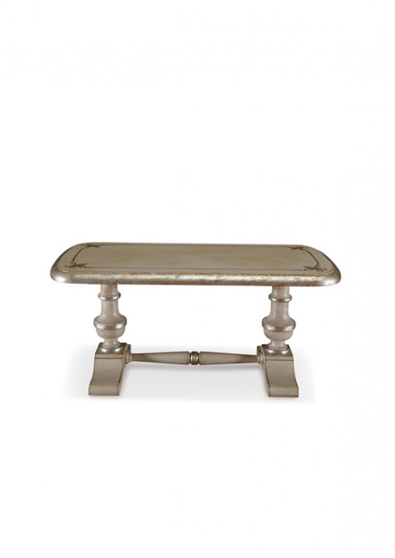 Suggerimenti di arredoTavolino da salotto con angoli arrotondati e gamboncini torniti.Finito laccato con decori in foglia argento. Laccatura anticata.